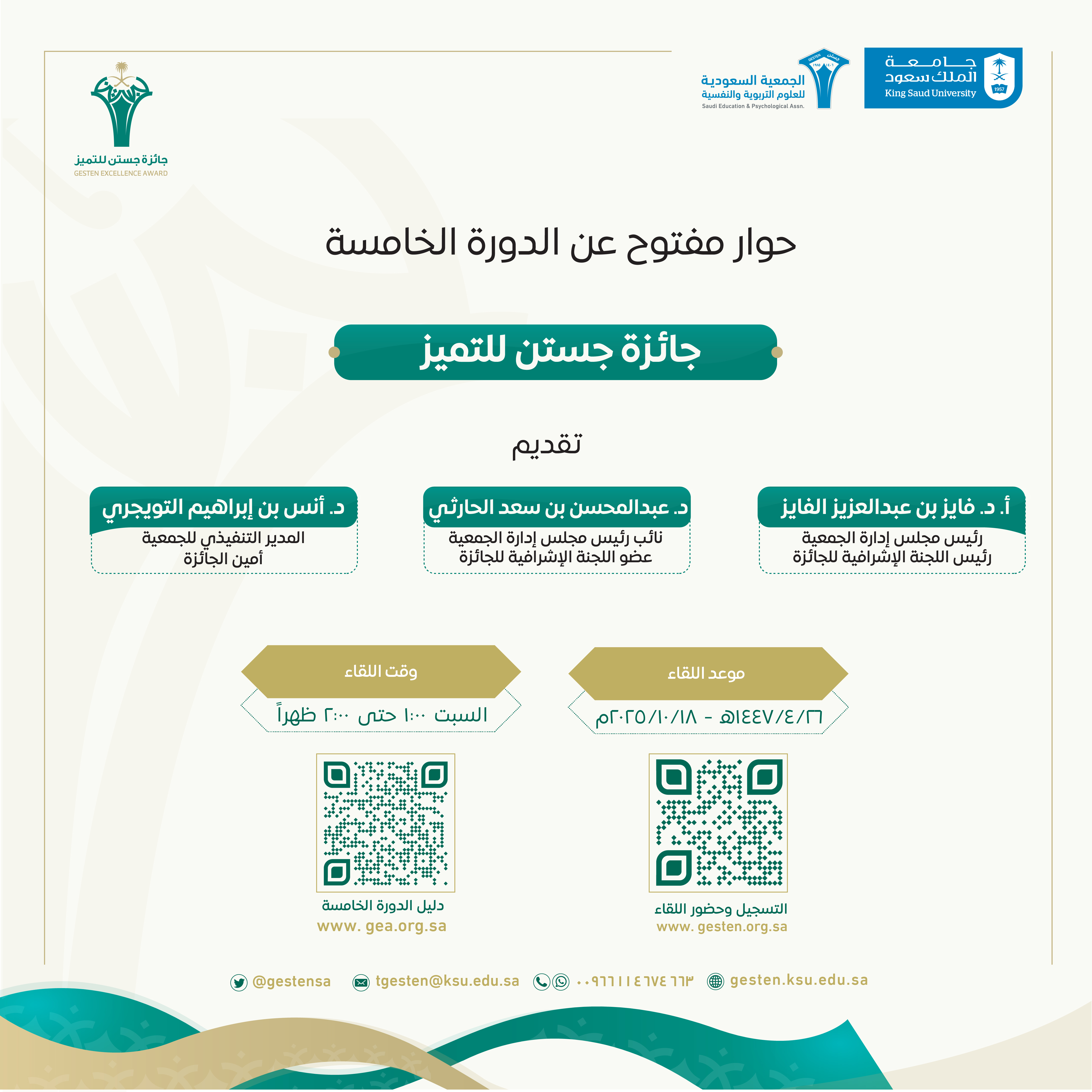 عام / الجمعية السعودية للعلوم التربوية والنفسية "جستن" تعلن بدء الترشح للفوز بـ "جائزة جستن للتميز"